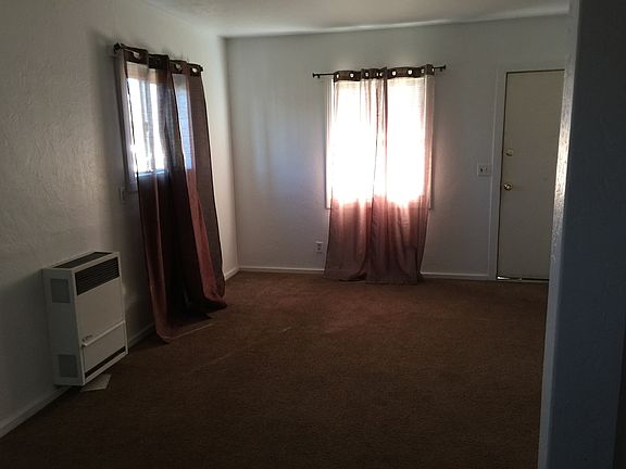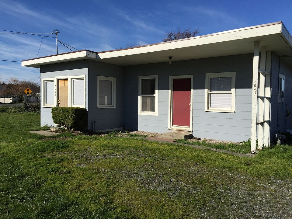 Cute and clean inside with newer carpet and paint, built-in cabinets, new roof, fenced yard with shed. This property is zoned commercial but has been used as residential rental. Nice starter home or use as office space for business, great location. Refrigerator and stove stay. Layout of rooms could easily be used as a 3rd bedrooms.