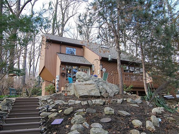 Contemporary Home in pristine condition! Perfect setting with lovely views from this Splendor in the woods on 3 Acres! Detached 2 Car Garage, Sun porch, Brand New Solid Wood Kitchen with Granite Countertops, subway tile backsplash, breakfast bar, stainless steel appliances. Living Room with Cathedral ceilings open to Dining Room with Wood Stove to warm you on those cold days, Finished Walk out daylight basement with southern exposure lets the natural light pour in! Upstairs, Master Bedroom Suite with Brand new remodeled Tile Master Bath, Walk-in Closet, 2 more nice sized Bedrooms share another full bath, Small Fish Pond, 2 Patios, Deck, Large Boulders, Fire Pit, Shed, Wooded/Private setting integral to shopping and major routes. One of a kind! Spectacular!