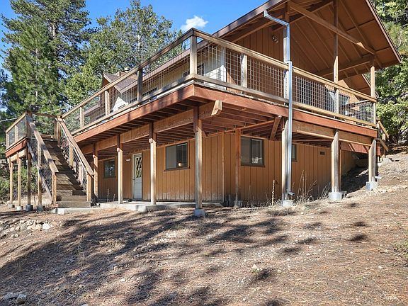 Lovely house located atop a hillside surrounded by mature pine trees with elevated stunningly beautiful views of pine tree filled mountains and blue skies in the distance out of large windows in spacious upper open floor plan living room, dining room and kitchen, vaulted wood beam ceilings, large wrap around deck, 2 bedrooms on upper floor, 2 full bathrooms (one on each floor), huge expansive downstairs bonus room (can be used as a third bedroom or recreation room etc.) with its own separate entrance and deck, large laundry room off bonus room the size of an eat in kitchen with washer/dryer, sink and extra refrigerator. Convenient off-street parking in back of house next to upper floor entrance. Located in Cold Springs (near Sonora) in Tuolumne County. Just a short drive to Pinecrest Lake Resort and Dodge Ridge Ski Resort. 3 Bedrooms, 2 Full Bathrooms 1672 sq. ft Easy access to Highway 108 Convenient off-street parking in back of house next to upper floor entrance High Speed Internet, Cable TV, Landline and Cell Phone Service available at renter's expense (free antenna TV) 1 Year Lease Pets: Well-behaved housebroken pets considered. Unfurnished Renter pays all utilities. High Speed Internet, Cable TV, Landline and Cell Phone Service available at renter's expense (free antenna TV). No smoking allowed. Renter's insurance required. Must have good credit report, references, reliable income.