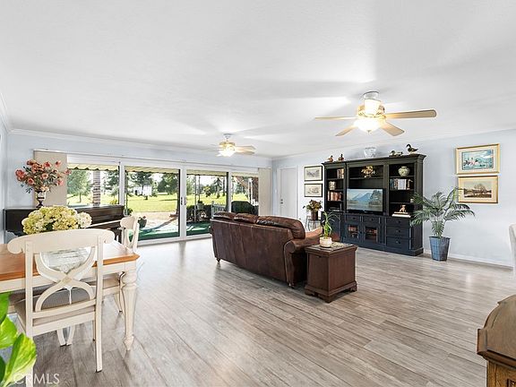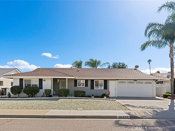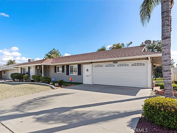 Beautiful. Senior 55+ 2 bedrooms, 2 bath Open Concept View home with a 2-car garage, Bonus room & remodeled kitchen. On a cul-de-sac & located in a quiet area of the golf course community of the Sun City District of Menifee. You will love the immense double slider & windows in the great room, & large slider in the primary bedroom which lead out to a very large entertainment patio, most of which is covered. Newer modern laminate flooring in the main living areas of the home! The bathrooms are tastefully upgraded & en suite for the primary & very close to the 2nd bedroom. Garage with automatic opener & direct access to the kitchen & bonus rms. Property is all-electric, so a great candidate for a future solar project! Square footage of the Bonus/Office/Craft room is not included in the total for the home. Close to dining, shopping, banks, churches, the Menifee Global Medical Center & the SCCA Recreation facilities, which include swimming pools, spa, gym, lawn bowling, horseshoes, pickleball, shuffleboard & many clubs and activities at less than $400 per year! Also, 7 minutes to the Cherry Hills Golf Course, the expanding Menifee Town Center & the I215 freeway. Low taxes, come see today!