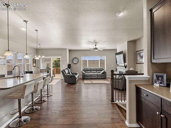 Pride in ownership can be seen (& felt) from the moment you pull up to this home! This home offers main level living with an open floor plan where the rooms flow seamlessly into one another. The kitchen is sure to delight any level chef with upgraded appliances, pantry, huge island, quartz counters, & plentiful dark maple cabinets with soft close drawers. Front range & Pikes Peak views are on display from the living room, dining room & primary suite as well as the deck. The Primary suite features an adjoining bathroom with large shower, dual vanity, a walk-in closet and a linen closet. A secondary bedroom, full bath & oversize laundry room complete the main level. The walk-out basement has high ceilings allowing for lots of light and includes a spacious family room, 2 large bedrooms, full bath and a sizable storage area. The outdoor living space is sure to impress too! There is a 12x12 deck off dining room, an immense patio with pergola, fire pit and hot tub area off of the family room in walk-out basement AND a cozy sitting area just outside of front door. Located on a cul-de-sac with convenient access to shopping, military bases, parks & trails, this home is one to see!