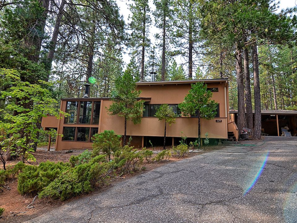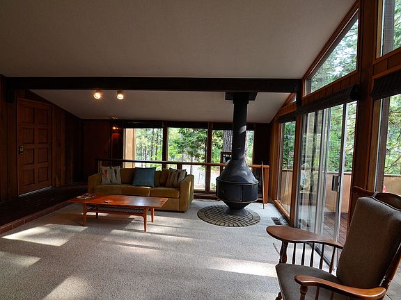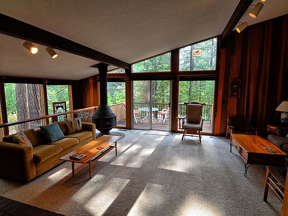 The Glass Cabin, This Blue Lake Springs cabin has a contemporary style. The living space boasts large walls of glass lending to the feeling of being in the trees. Open living space for gatherings balances with cozy spaces to tuck in and have solitude. 4 bedrooms 3 baths with a reading and sleeping loft. Conversation pit with double sided fireplace. Large light filled master on the entry level. Hot tub off master bedroom.