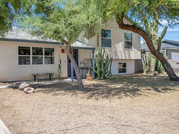 Don't miss out on this unique tri-level home on larger lot with sparkling diving pool, low maintenance desert landscaping and NO HOA! All new dual pane windows installed 2010 w/ transferable lifetime warranty! Enter through the front door to an open and airy main living area featuring vaulted ceilings, a cozy fireplace and authentic saltillo tile throughout. Open, updated kitchen and separate dining area round out the 1st level. The 2nd level boasts the master bedroom with separate full bath, second and third bedrooms, and full guest bath. Located on the basement level is a spacious BONUS family room, fourth bedroom and spacious laundry room. Beat the heat in your spacious backyard complete with sparkling diving pool, citrus and shade trees, and low maintenance desert landscaping.