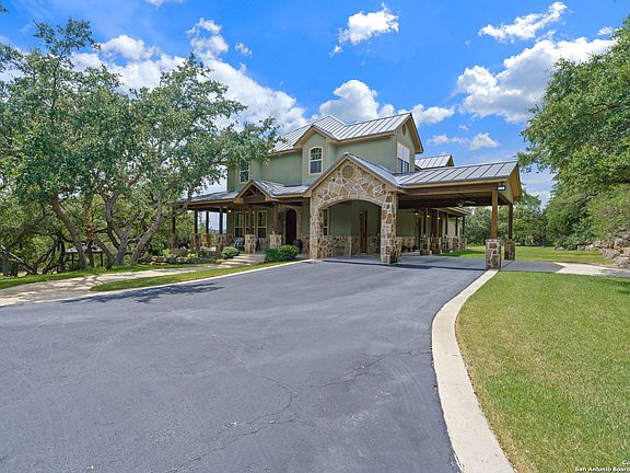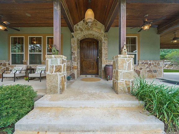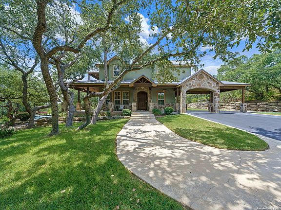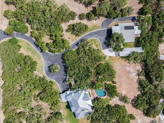 *Unique One-of-a-Kind property!* Secured behind a private automated gate, nestled amongst majestic oaks, lies a beautiful private oasis situated on 3.1 sprawling acres. The architectural details and true craftsmanship are evident the moment you step inside this custom home brimming with character, warmth, and casual elegance. Cypress wood paneled ceilings over expansive three-sided wrap-around covered porches and upstairs game room, a two-story rock fireplace, accent rock arches, custom Alder-wood kitchen cabinets and built-ins, custom wood shutters, electric blinds, a walk-in safe, a powerful whole house Generac Generator, two large water storage tanks, are just a few of the details that make this jewel so desirable. The spacious primary bedroom, conveniently located on the ground floor, offers a serine sanctuary complete with high trayed ceilings, a cozy fireplace, and custom shutters, which open to a lovely view out back, and an exterior door accessing the patio and pool area. The ensuite luxurious bathroom with a dual vanity, a soothing jetted soaking tub, oversized walk-in shower and large his and her closet complete this personal retreat. From the well laid-out double island kitchen with stainless steel appliances, to the open two-story ceilinged family room, large picture windows and 16-foot Anderson sliding doors bathe the spacious open floorplan in natural light and provide picturesque views of a sparkling heated pool and spa, as well as the grounds of your own Hill Country refuge and beyond. Stunning living spaces with seamless indoor/outdoor integration transport you out to expansive multiple patios for outdoor living and entertaining. For the car enthusiast, person who wants the ultimate workshop, or wants to house their RV, Boat, etc. or just about anything your imagination can come up with, you can take pride in the two enormous, insulated, finished-out, airconditioned (larger one is also heated) buildings in the lower part of the property. This one-of-a-kind estate has it all! Too much to mention!