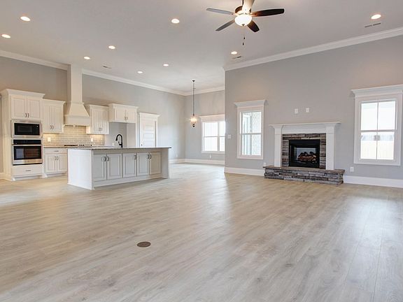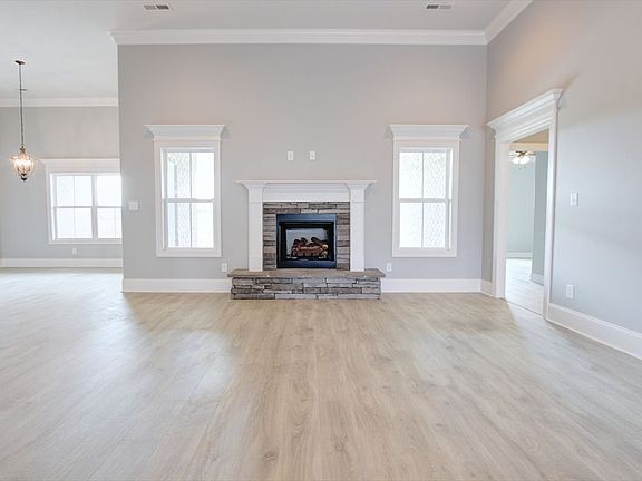 All brick Hamilton Plan B is an open plan with a 3 car side entry garage backed by a 2-10 home warranty.. Home has 4 bedrooms, 3 baths. Home has wood plus flooring (Mohawk Revwood) in all living areas and bedrooms. Great Room features 12' ceiling, extensive trim, gas-log fireplace with upgraded fireplace treatment, wood plus flooring, floor outlet, recessed lights and ceiling fan. Dining room has 12' coffered ceiling, wood plus flooring, extensive trim including shadow box under chair rail. Kitchen includes 12' ceiling, custom cabinetry and granite counter tops, large island with extra storage and countertop seating, stainless appliances including dishwasher, gas cooktop, wall oven and wall microwave, tile backsplash, wood plus flooring, recessed lighting, and huge walk-in pantry. Breakfast has 12' ceiling, wood plus flooring. Master bedroom has 11' double tray ceiling, wood plus flooring, recessed lighting, extensive trim and ceiling fan. Master bath has 11' ceilings, glamour tub, large tile shower with two shower heads and rimless shower door, separate toilet area, double vanity with granite countertops and large walk-in closet. The additional bedrooms have 9' ceilings, wood plus flooring, ceiling fans and crown molding. The additional baths have tile flooring and granite counter tops. Laundry has 9' ceiling, custom cabinet, and tile flooring. Home has large rear covered porch with ceiling fan as well as additional covered porch behind the breakfast area. Optional Kitchen h