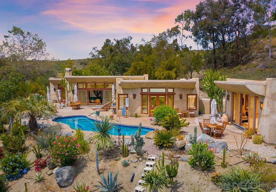 An architect and heritage property that will be internationally renowned for all time. Designed with an absolute integration of the nobility of nature and the multi-needs function of modern life, this 3100sf, 4 bedroom with optional 5th bedroom, 4 full bathroom home is a contemporary southwestern style home (in the words of the architects) includes an arbored entry courtyard, cabana, passively heated black-bottom pool and detached garage. A portion of the north edge of the building is embedded in the hillside, a decision that reduced heating and cooling needs by drawing on the Earth's thermal mass to mediate the temperature.'' This is the unique collaboration between function and nature referenced above that identifies the Hubbell architecture. Oriented to view Mount Kuchumaa, generous roof overhangs maximize solar heat gain during summer and allow low winter sun to passively heat the home. Ceilings are high with transom windows to take advantage of natural convection. Natural wood doors and windows and low-energy lighting are used through. The landscape incorporates low-water/maintenance native vegetation in stunning groupings. Straw-bale construction - baled, stacked and covered with plaster provide beauty and endurance with two-foot thick walls with excellent sound as well as temperature insulation. The lot is 118,483 sf. designed as a personal Eden and retreat with paths and natural grounds, yet only 30 minutes from San Diego. SEE SUPPLEMENT FOR MORE INFORMATION.