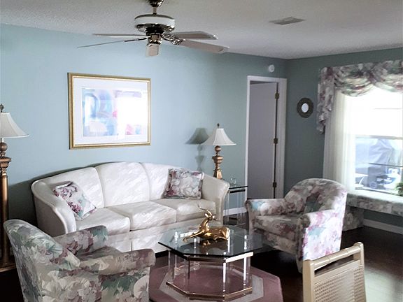 This lovely 2/2/2 home is located in the award winning 55+ gated golf community of Timber Pines. Gorgeous laminate flooring and tile throughout. Beautiful Hunter Douglas honeycomb solar blinds in family room. Imagine yourself sitting in the screened lanai with one-half roof covered, enjoying Florida weather and the beautiful park-like landscaping. Timber Pines offers 4 pristine golf courses, tennis and pickleball courts, bocce, horseshoes, shuffleboards, 2 large heated pools w/spas, billiard room, walking nature paths, woodworking shop, lodge/community center, private country club with restaurant/bar, Performing Arts Center and over 100 clubs/orgs. available to join. Basic cable and high-speed internet included in HOA. Visit www.timberpines.com to view informational video. Schedule your visit today.