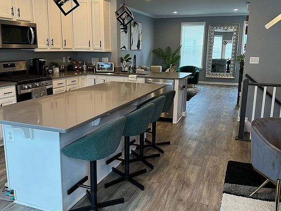 Oversized islandWalk-in closetTwo-car garageQuartz countertopsWhite cabinetsStainless-steel appliancesWell-appointed kitchen