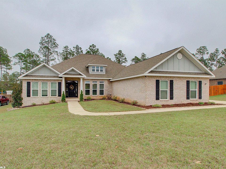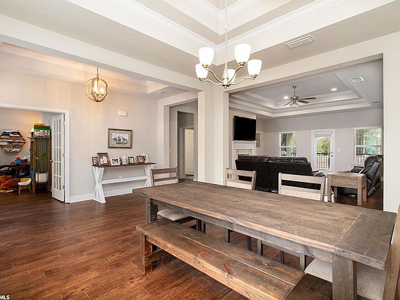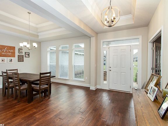 Located in prestigious The Reserve at Daphne, this beautiful one-story home features 4 bedrooms and 3 full bathrooms. The Mila floor plan offers an open concept with a split bedroom floor plan. This home sits on a large landscaped lot backed up to woods. Soaring ceilings and laminate hardwood floors throughout except for carpet in bedrooms. Spacious primary with extra-large closet, dual vanities, bathtub and a separate shower, a private water closet is tucked away with a view of the large fenced in backyard with its own door to the covered patio. Kitchen with granite counter tops, white cabinets, pantry, 5 burner gas range stove, white subway tile, stainless appliances and spacious island overlooking the living room with a gas log fireplace. 2 of the bedrooms feature a Jack and Jill bathroom layout with dual vanities, private water closet and a tub/shower combo. The 4th bedroom has a full bathroom across the hall. This home also features a nice size office with French doors, a formal dining room and a 3 -car garage with floored attic. Gold Fortified.