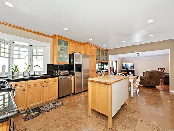 The kitchen has been remodeled with stainless appliances, custom cabinets, custom woodwork and has been expanded to open on to the huge family room addition. The spacious familyroom has wood floors, built-in media center and french doors. Front living room has romantic fireplace, french doors, custom windows and crown molding. All bathrooms have been completely remodelled with high end appliances and plumbing fixtures. Hall bathroom was expanded to include a clawfoot tub and pedestal sink. There are 3 bedrooms and 2 baths down stairs and a large office work space. The entire second level of the home is a private master suite with large master bathroom, numerous walk-in closets and a view of the swimming pool. Lake Mission Viejo membership & facilities use. Property has a separate pool house. Don't let the exterior fool you, the interior of the home is highly upgraded!