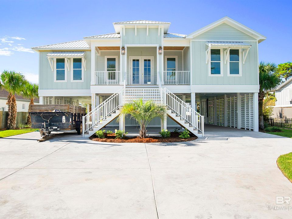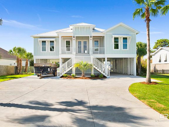 Experience luxurious waterfront coastal living in this BRAND NEW Gold Fortified home located on the highly sought-after Marina Road in Orange Beach, which ensures top-tier durability, lower insurance costs, and a peace of mind. Designed with both style and functionality in mind, this stunning property offers everything you need. This house features 5 spacious bedrooms, 4 full baths, an elevator, and an expansive open floor concept of the kitchen, living, and dining area which is perfect for entertaining. Every detail has been thoughtfully planned and selected to provide a perfect blend of modern elegance and coastal luxury. A butler's pantry just off the kitchen, has double Charles Phillips antique entry doors, an additional bar sink, ice machine, with plenty of storage. Engineered hardwood floors throughout the house, all bathrooms have custom tile floors and surrounds. The living room has a cathedral ceiling with wood beams enhancing the natural light and airy feel, and an electric fireplace, you can use year round, creating a cozy, inviting atmosphere. There is not one, but two waterfront primary suites, one entailing a custom tongue and groove tray ceiling and beautiful custom accent wall. The large utility room contains ample storage, and there is almost 500 sq. ft. of heated and cooled space downstairs in addition to the upstairs living area. A bunk room, game room, or tackle area are just some of the possibilities for this space. Covered parking, professionally landscaped yard with irrigation, and a covered entertaining area with a custom built bar and a place to watch your favorite college football games. There are two large boat slips, providing convenience and makes waterfront living effortless and enjoyable. Finally, unwind on the expansive back porch, a true outdoor retreat perfect for enjoying the coastal breezes, sunsets, waterfront views, lounging, and entertaining. You will create an unforgettable living experience for yourself and all who visit. Bu
