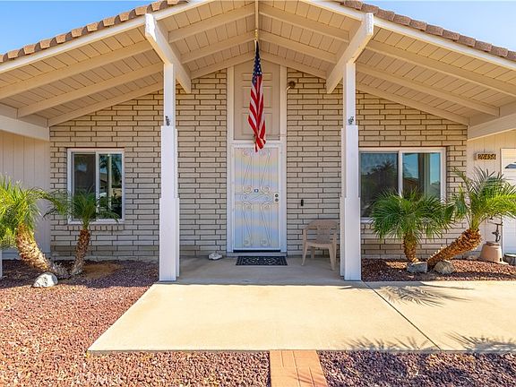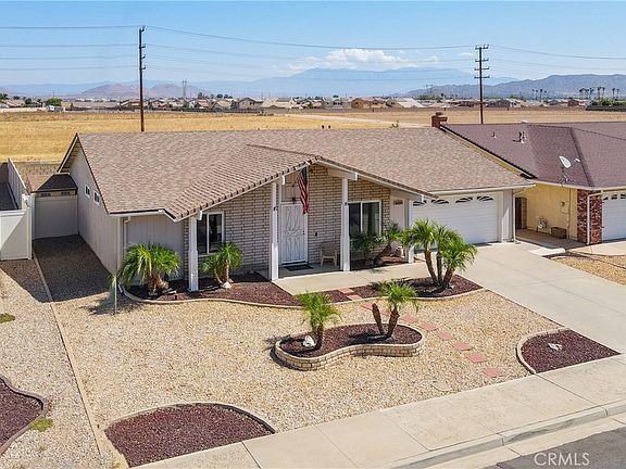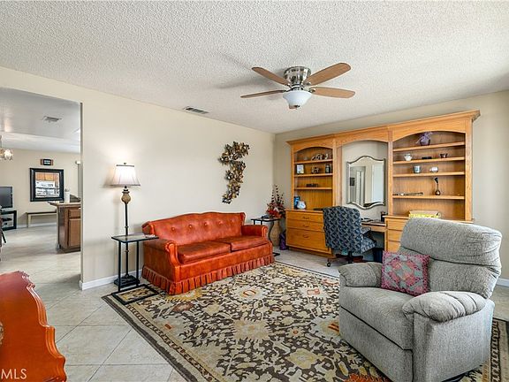 **MUST SEE HOME** in Senior 55+ Community with no HOA Built in 1985. Pride of Ownership shows throughout this single-family home with 2 Bedrooms, 2 Full Baths. Approximately 1328 square feet. Enter into the Large Living Room that has a Built-in Bookcase and Desk. Continuing to the Kitchen which is open to the Family/Dining room, the countertops are Granite, there is a Gas Range, Built-in Microwave above the range, Dishwasher, Refrigerator is staying, a large Cabinet for a pantry, and a long counter to sit/eat at. The Windows, Front Door and Sliding Doors are just a couple of years old. There is Travertine flooring throughout all the living spaces. Wood laminated flooring in the bedrooms, and there are ceiling fans in all the rooms. The A/C and Heater has a Nest thermostat which is programable from your phone or manually accessed. There is a whole house Water Softener and Reverse Osmosis System in the kitchen for the sink and refrigerator. Down the hallway to the rear of the home is the Primary Bedroom with Double 2-Door Mirrored Closet across the entire wall, a Built-in Mirrored Vanity Area, and the Ensuite Bathroom with large Step-in Shower. A large sliding door gives you access to the backyard patio area. The Second Bedroom is in the front of the home and has a walk-in closet. The Second Bathroom has a combination tub/shower. Going outside to the large Covered Backyard Patio accessed using the sliding door from the Family/Dining Room. The patio area wraps along the entire back of the home with large areas to enjoy the backyard and to see the views of the hills and the mountains. From the Kitchen there is Direct Access into the 2-Car Garage. The Garage has Built-in Storage, a Work Bench, a Sink and 2 moveable workstations. The Laundry Area is in the garage and the Washer and Dryer are staying along with a garage Refrigerator and separate Freezer. It will be easy to Maintain the Low Maintenance Landscaping with Automatic Drip Sprinklers in both the front and back yards. The backyard has many, many Fruit Trees. Located close by to Shopping, Dining, Banking, Medical, and the Freeway. One hour to the beach cities/high desert/Ontario airport. The low taxes and no association fees make this a highly sought after home. Schedule an appointment to see this home before it is too late!