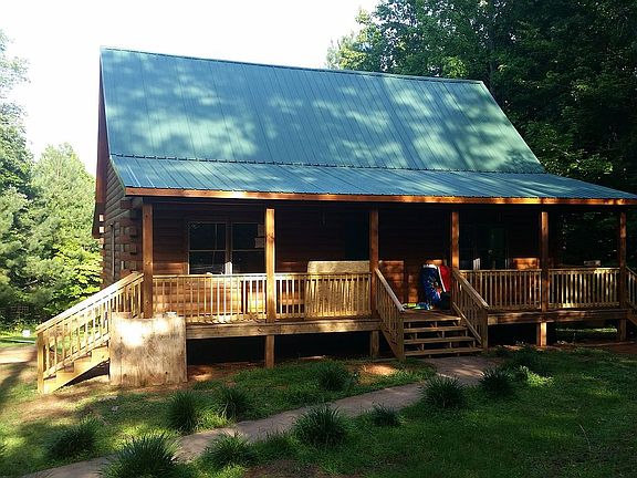 Vaulted ceilings in living room and kitchen. Beautiful log walls with hardwood flooring. Full (unfinished) basement with walk-in access to the back patio through double doors. Full brick patio and hot tub out back with barbeque island and fire pit. New metal roof and pine ceiling boards with ceiling fans on covered decks front and back. All new doors, windows, stained and sealed logs with new chinking.
