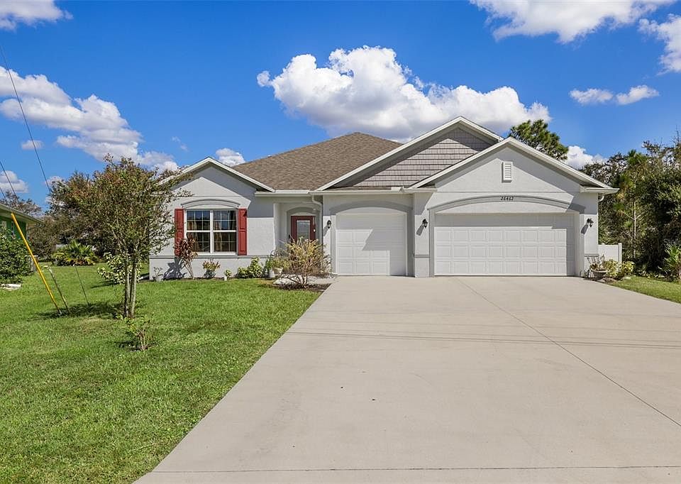 Stunning 3-Bed, 2-Bath Home with 3-Car Garage on a Private Lot in Punta Gorda! Nestled in the desirable Deep Creek subdivision of Charlotte County, this gorgeous property offers an inviting blend of comfort and sophistication. With a spacious 3-bedroom, 2-bath layout and a 3-car garage, it’s perfectly suited for family living and entertaining. The property boasts a long concrete driveway, ensuring ample parking, and a private lot that provides peace and tranquility. The home’s modern white kitchen is a true centerpiece, featuring sleek granite countertops, a large island and ample cabinetry, making it a chef’s dream. Designed for both functionality and style, the open-concept living and dining areas offer abundant space and light, complemented by durable tile flooring throughout the main areas and cozy carpeting in the bedrooms. In addition to the generous bedrooms, this home includes a versatile den/office space—perfect for remote work or a cozy reading nook. Outside, you’ll enjoy easy access to all the amenities that make Deep Creek special, including local parks, golf courses, and recreational facilities. A short drive brings you to vibrant downtown Punta Gorda, where you can explore charming shops, delightful dining, and the lively waterfront, rich with arts and culture.