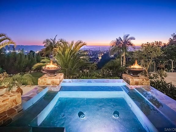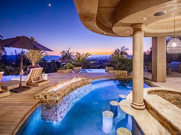 A commanding hilltop estate that defines luxury living and unparalleled privacy awaits you. Set on nearly one acre at the end of a quiet cul-de-sac, this Mediterranean masterpiece offers breathtaking panoramic views of the Pacific Ocean, Batiquitos Lagoon, and the La Costa golf course from nearly every vantage point. Inside, soaring ceilings and a dramatic 40-foot glass window wall illuminate the expansive 9,542 square-foot residence with natural light, beautifully blending indoor and outdoor spaces. Impeccably crafted with imported stone and marble flooring, Italian Albertini windows and doors, and custom lighting, this home balances timeless elegance with modern refinement. Five spacious ensuite bedrooms provide exceptional comfort, highlighted by a stunning primary suite with a spa-inspired bath and dual walk-in closets. The chef’s kitchen is a culinary dream, featuring dual islands, premium appliances, and an adjacent catering kitchen. Wine enthusiasts will appreciate the custom 900-bottle temperature-controlled cellar, perfectly designed for entertaining or private collections. Designed for seamless entertaining, the resort-style backyard is an oasis with two pools, an oversized spa, a swim-up bar, full outdoor kitchen, and expansive terraces framed by lush tropical landscaping. A separate pool cabana with a full kitchen and lounge space completes this extraordinary retreat, making hosting effortless and unforgettable. This rare and remarkable property delivers the best of Southern California living: privacy, scale, design, and unobstructed views—all in one of North County’s most desirable coastal enclaves.