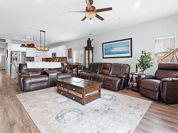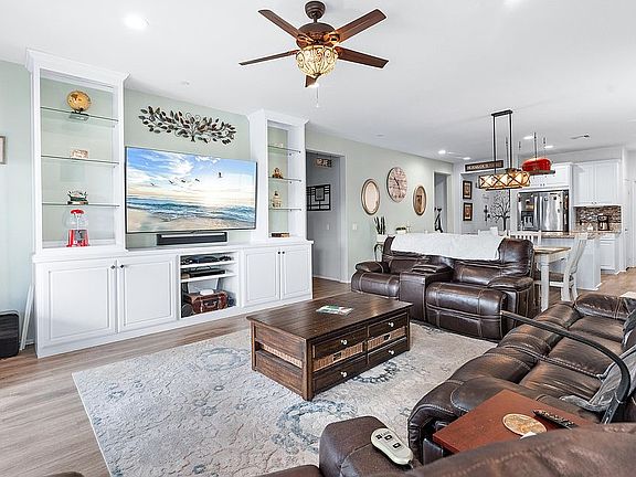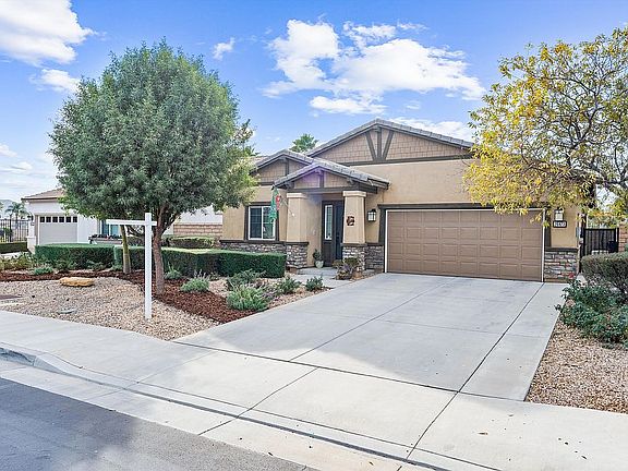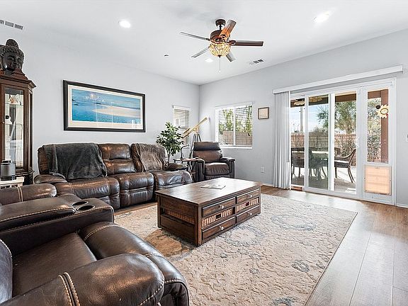 Discover comfort and serenity in this charming Menifee home, located in the coveted Holiday 55+ gated community. Featuring an open floor plan with hardwood-style flooring, a custom-built entertainment center, and elegant blinds, the living spaces are designed for both style and functionality. The family room offers built-in cabinetry, while the modern kitchen impresses with stainless steel appliances, granite countertops, a spacious island, and a walk-in pantry. Relax in the two inviting bedrooms, each with plush carpeting and soothing tones. The primary suite boasts a walk-in closet and an ensuite with tasteful tilework and a walk-in shower. Outside, a shaded patio and low-maintenance artificial turf create the perfect setting for gardening or recreation. Additional highlights include a laundry room with cabinetry, owned solar panels, and an epoxy-floored two-car garage. Enjoy community amenities such as a pool, spa, gym, and clubhouse. Conveniently near freeways, shopping, and medical facilities, this home is a must-see!