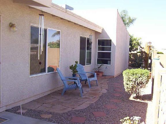 Fantastic home in a great neighborhood! This charming 3 bedroom home is simply perfect. Ceramic tile in living room & dining room, vaulted ceilings & custom paint. Spotlessly clean & well cared for. Spacious and bright, you`ll want to hurry. It also has a split floorplan, newer roof and A/C plus a two-car garage. Located next to the common area & close to shopping and Loop 202 makes it just right. It has both a lovely side and back yard with a partial view fence, beautifully landscaped, but easy to maintain. Two citrus trees, small grassy area and desert scape! Now add the sparkling community pool, and you simply can`t resist!