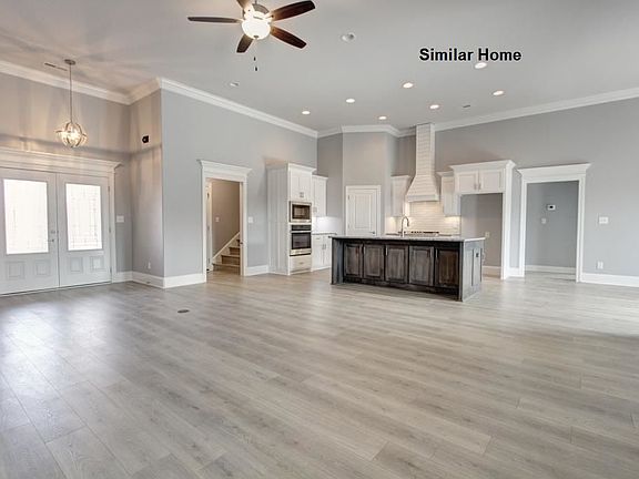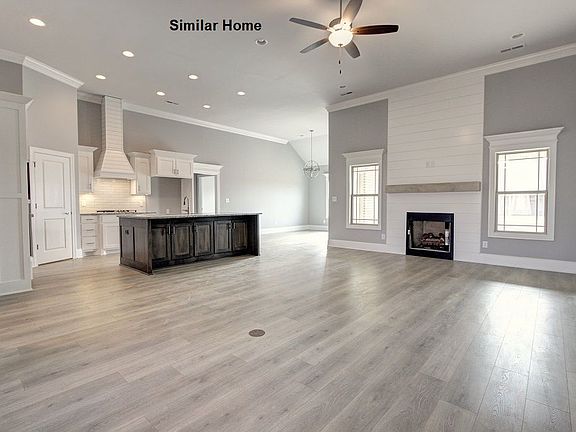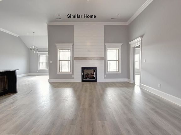 All brick Woodmont Plan A is an open floor plan with 3 car side entry garage and a large bonus up is backed by a 2-10 home warranty.. Home has 4 bedrooms and 3 baths. Home has wood plus flooring (Mohawk Revwood, Engineered Hardwood or similar product) in all living areas and bedrooms. Great Room features 12' ceiling, extensive trim, gas-log fireplace with upgraded fireplace treatment, floor outlet, recessed lights and ceiling fan. Open Kitchen includes 12' ceiling, soft close custom cabinetry with granite countertops, large island with extra storage and countertop seating, stainless appliances (Gas Cooktop, Cabinet Vent Hood, Wall Oven, Wall Microwave, Dishwasher), tile backsplash, recessed and under cabinet lighting, and a pantry. Breakfast features 12' ceiling and extensive trim. Master bedroom has 11' double tray ceiling, extensive trim, recessed lighting and ceiling fan. Master bath has 11' ceilings, glamour tub, tile shower with rimless door, separate toilet area, double vanity and large walk-in closet. Oversized other bedrooms with 9' ceiling, crown molding and ceiling fan. The additional baths have 9' ceilings, tile flooring and granite countertops. Dropzone bench by door to garage. Wood stairs led to large upstairs bonus room which has crown molding and ceiling fan. Laundry has 9' ceiling, custom cabinet and tile flooring. Home has a covered back porch with ceiling fan. Home has a tankless water heater. Home includes a fully sodded yard, gutters including piping under