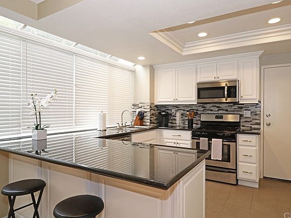 As you step through the front door you'll be captivated by the spacious open floor plan, vaulted ceilings & beautifully remodeled kitchen. The 2015 kitchen remodel includes: brand new cabinets, black granite counters w/breakfast bar, subway tile style back splash, stainless steel sink, Frigidaire 4 burner gas stove, built-in microwave, stainless steel dishwasher, refrigerator (included), new tile flooring that stretches from the kitchen to the laundry area & beyond to the bathroom. The first floor bathroom was also remodeled & features a matching granite counter & newly tiled designer look shower w/frame-less glass doors. Adjacent to the kitchen is a generous pantry and laundry area w/stacked LG front loading washer & dryer (also included). The floor plan also includes a dining area, large family room w/fireplace, wall mounted Panasonic big screen TV, spacious first floor bedroom & direct access to a private enclosed back patio. Other upgrades include recessed lighting throughout the downstairs, all new dual-pane windows (excluding the kitchen window) & 2 inch wood-look blinds throughout. Upstairs you'll find 2 more spacious bedrooms with ceiling fans & vaulted ceilings. The master bedroom has 2 closets, both with mirrored wardrobe doors. In this floor plan you'll also find the much sought after feature of direct access to a 2-car garage with new upgraded sectional garage door and new automatic opener that features a special electronic locking mechanism.