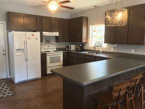 Beautiful view from covered back porch overlooks 100' sea-walled river frontage on Pt A Lake! 2BR/2bth home built in 2016 lives like new! 9 ft ceilings and beautifully finished cabinet-grade birch plywood floors throughout. Open concept in kitchen and living area. Kitchen features dark wood cabinetry and deep drawers for ample storage. A spacious feel abounds with large laundry room, walk-in closets, a 10'x40' covered back porch, and walk-in storage under the house. Boat house and separate dock with electricity and running water make for fun fishing and easy cleanup. New wood privacy fence.