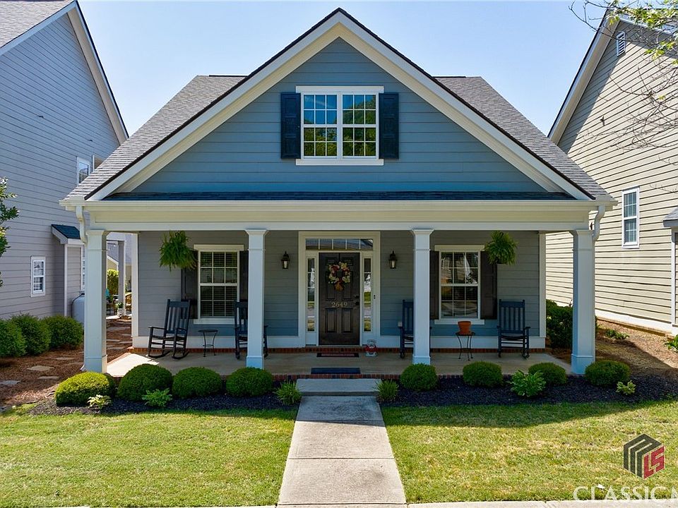 Don’t miss out on this charming craftsman home that is located in Oconee County, in a swim and tennis gated community, and it is in the North Oconee School District. This home includes 3 bedrooms, 2.5 baths, family room, eat-in kitchen area, dining area, large laundry room, oversized garage, wonderful rocking chair front porch, and a covered patio. The main level showcases high vaulted ceilings, stacked stone fireplace, lots of windows and gorgeous hardwood floors. The kitchen includes granite counters, tile backsplash, and the stainless appliances are less than a year old. All bedrooms are located upstairs. The primary suite is very spacious with extra room for a sitting area. Both the primary bathroom and the hall bathroom have double vanities and linen closets. This home is immaculate, plus Franklin Grove offers fantastic amenities! They include tennis courts, large pool, playground and a clubhouse with an exercise room! The HOA also includes lawn maintenance and weekly trash pick up. This gated subdivision is in a great location that is surrounded by restaurants, activities, easy access to University of Georgia and Athens, Highway 316, Epps Bridge shopping area.