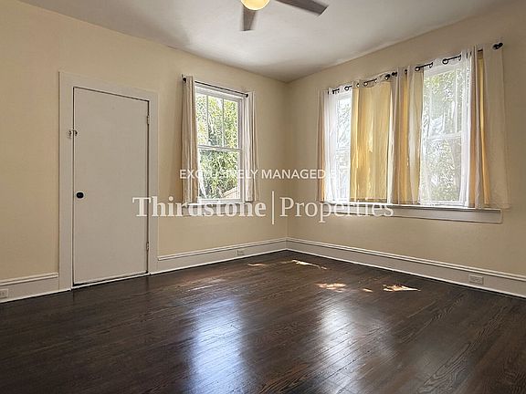 Visit this charming home on a truly private street in the heart of Riverside. Step inside this inviting 2 bedroom, 1 bath home featuring stunning dark hardwood flooring throughout, beautifully contrasting with the bright walls for a warm and welcoming aesthetic. Modern upgrades include ceiling fans to keep the air circulating, stylish doors, drapes on many windows, and thoughtful finishes that bring character to every room. The kitchen boasts stainless steel appliances including a dishwasher and over-the-range microwave paired with a chic backsplash and ample storage in bright shaker cabinetry. Bay windows flood the space with natural light, creating a cheerful and airy atmosphere. A unique highlight of the home is the blue-colored fireplace, which serves as a stylish focal point (please note that it is inoperable). A washer and dryer are provided for added convenience. This home blends classic charm with modern touches, making it a perfect place to call home. You'll also have access to two sheds located in the backyard for more storage. The residents are responsible for all utilities and lawn care. Cats are welcome, dogs are not permitted. Application fee $55 per person 18 and over. Lease Term: 12 months.
