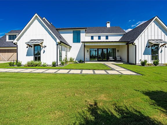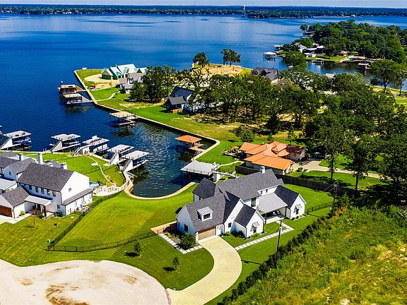 Sprawling modern farmhouse, custom-built in 2022, positioned on two waterfront lots. Open living and dining with vaulted ceilings, wood floors, and a wall of windows framing stunning lake views. The cook's kitchen offers an island eating bar, abundant counter space, gas cooking, beverage refrigerator, ice maker, and a butlers pantry. The primary suite features lake views, luxury bath, and a walk in shower. Three guest en-suites are located on the main level, while the second-level flex room with full bath is perfect for kids or guests. Outdoor living shines with a spacious covered patio featuring wood ceilings, ceiling fans, fireplace and television. The large fenced yard leads to a double boathouse with sundeck - ideal for enjoying all the lake has to offer.