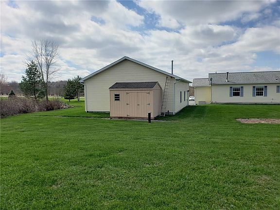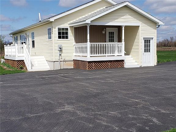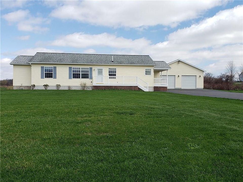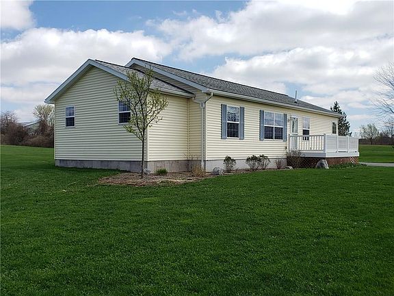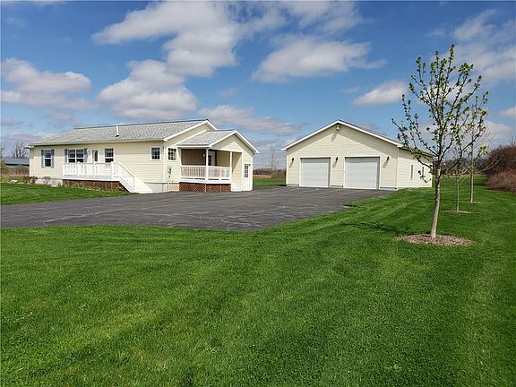 Ranch built in 2005 and remodeled in 2012 has 1460 sq.ft. Features include covered porch and open front deck with "gorilla" decking and railings, paved driveway and 1200 sq.ft garage all on 5.6 acres in the town of Hopewell in the Canandaigua school district. Interior features spacious well planned kitchen adjoins the multi purpose dining and living room combo with oak hardwood flooring. This open floor plan has 1st floor master bedroom, full bath and walk in closet, 2nd and 3rd bedrooms carpeted with spacious closets.It has a full partly finished basement with exterior and interior entry. The 30 X 40 double door garage has finished walls, windows, electric and propane heater.