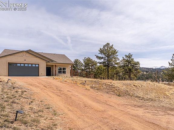 Nestled at the back end of Colorado Mountain Estates, this 3-bedroom, 2-bathroom rancher offers the perfect blend of modern comfort, ADA accessibility, and peaceful mountain living. Built in 2018 and beautifully maintained, the home sits on a private, tree-lined 2-acre lot and features a walk-out lower level, an attached 2-car garage, and a fenced-in dog run- ideal for pet lovers. Step inside to an inviting open-concept main level with vaulted ceilings, LVP flooring, and large windows that fill the space with natural light. The kitchen boasts maple cabinetry, a built-in hot water dispenser, and seamless flow to the dining and living areas. The spacious primary suite includes an ADA-accessible curbless shower and wide doors for easy mobility. Downstairs, the walk-out basement offers two generously sized bedrooms, a large second family room, and a 3/4 bath- perfect for guests or multi-generational living. Relax outdoors on the covered front porch, side deck, or the concrete patio, all while taking in views of meadows, rock formations, and nearby mountain ranges including Pikes Peak. Located just minutes from Teller County Road 1, you’ll have convenient access to hiking, fishing, and parks including Mueller State Park, Dome Rock Wildlife Area, and the Florissant Fossil Beds. Don’t miss this unique opportunity to own a move-in-ready mountain home with modern finishes and accessibility in mind!