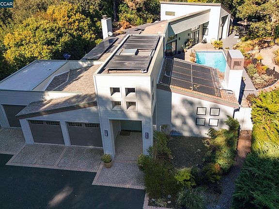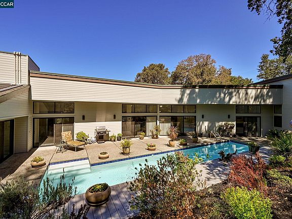 Down a private country road in Tice Valley, & just 2 miles from downtown Walnut Creek, this single-level mid-century modern home offers tranquility & privacy. Situated on a .88-acre wooded lot, this sophisticated home is surrounded by oak-studded hills, providing absolute serene escape. As you approach you’re welcomed by an estate-like ambiance. The home’s approximately 3,145 sq. ft. 3 bedrooms 3 baths layout features soaring ceilings, walls of glass & picturesque views of the inviting pool & lush surroundings. Outside discover a private oasis designed for relaxation & entertainment. The expansive outdoor area boasts a sparkling pool, perfect for enjoying summer nights & hosting gatherings with friends & family. The tranquil setting is complemented by a seasonal creek and majestic oak trees. Inside, the home’s design is both elegant & functional. The open-concept kitchen features a large island & casual dining area that seamlessly flows into the great room, with stunning views of the pool. A formal dining room offers a more intimate setting for special occasions. The spacious bedrooms & artistically designed baths plus an attached 3-car garage, 2-zone HVAC, & solar.