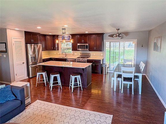 Nestled on a peaceful dead-end street, this inviting home offers the perfect blend of comfort and style. With four spacious bedrooms and three modern bathrooms, the split entry design creates a seamless flow throughout the open floor plan. The heart of the home is a well-appointed kitchen featuring sleek stainless steel appliances and a convenient wine fridge, ideal for culinary enthusiasts. The cozy family room, complete with a wood-burning fireplace, provides warm and inviting space for gatherings. Outside, the expansive fenced backyard offers a private oasis, perfect for children or pets to play, while the covered patio provides an excellent spot for outdoor dining and relaxation. This charming residence is a haven for those seeking both the serenity and functionality.