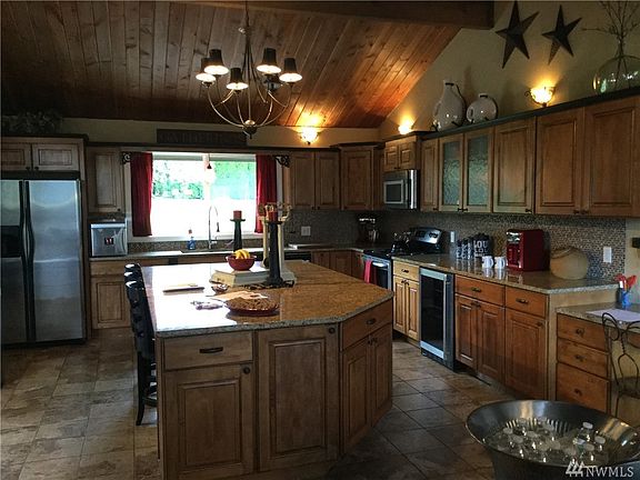Beautiful unique custom built home has all the bells & whistles. Entertain on the multi-level decks & patios overlooking the expansive back yard, hot tub, pool & pool house bar. 2800+ sqft full of wonderful features, 3 bed, 2 ?? bath, new kitchen w/granite counters, dining room w/a fireplace, living room has a full wall of windows & a fireplace, cozy wood stove in the lower family room, large storage room, gym w/spa & a tanning room, security system & a new paved driveway w/a gated entry.