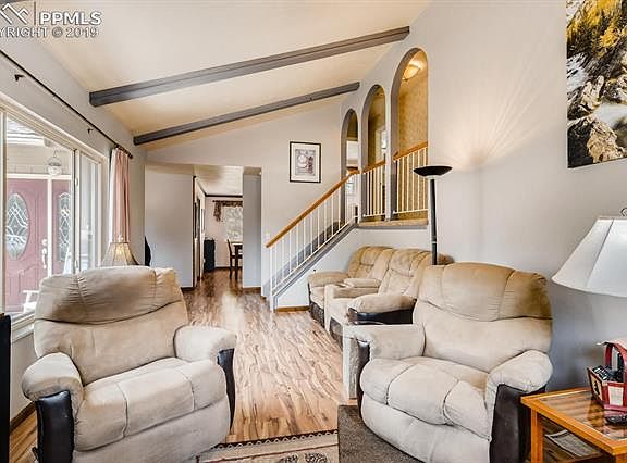 Located on a quiet street in Academy School District 20: lovely home with vaulted ceilings and large windows in the living room. Remodeled kitchen including granite counter tops, newer appliances, island and walk-out to landscaped yard. Large patio, private back yard, and open space to the rear of the property. Large family room with fireplace and built in shelves. Radon system. Newer flooring on main and upper levels. The lay out makes the home feel much larger than square footage indicates. Schedule a visit soon before it's gone!