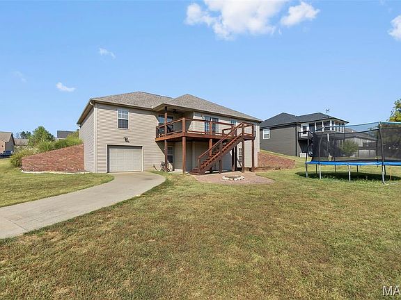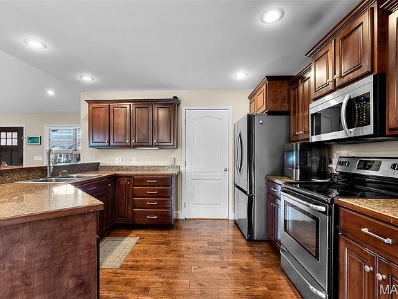 Sitting atop a expansive corner lot in Oak Creek Estates featuring a stone and brick front is this spacious, functional, charming home! Step inside, the floor plan is both inviting but also offers every day privacy with a split bedroom floor plan. Across the main level are hardwood floors, tile & carpet in the bedrooms to keep the cold off your feet in the chilly months! Cathedral ceilings with large windows on the front and back walls allow for natural lighting to expand across the open concept floor plan for entertaining in the main living area. The kitchen has stainless steel appliances, undermount lighting, a pantry cabinet, & new knobs. The private primary suite off the dining room has two windows and is large enough for a king sized bedroom suit. The bathroom features a walk in shower, double sinks, the perfect place for a vanity area, and an expansive walk in closet with built in shelving! Two large bedrooms are off the living room on the main level. The walkout basement is finished with tile floors and has a fourth bedroom, large walk in tile shower in the bathroom, living room with water access for a kitchenette, and a third garage / shop with a motor, perfect for storing a extra vehicle. Outside is a mature very large yard, partially covered composite deck floor off the dining room, covered front porch, and the sellers custom built in hidden closet under the deck.