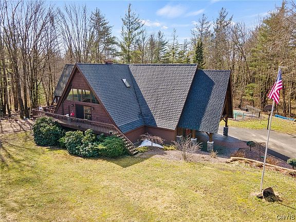 Magnificent home for sale located in Parish, NY! This unique contemporary A-frame style home is nestled on a private 4.64 acres and in the APW school district. This 2,500+ square foot home features four bedrooms and three full bathrooms. Beautiful updated kitchen with granite countertops and new stainless steel appliances. Enclosed rustic style porch dining room and formal living space with new laminate flooring and propane fireplace installed for the cold winter nights. Fully stocked game room (pool table, shuffle board, dart board, ETC.) and full bar with TV included for entertaining guests! Four season room with wrap around windows, in-floor heat, hot tub and electric sauna for relaxation. Walk out to the in-ground pool with a brand new pool pump and heater. Additional exterior features include the stylish new stamped concrete, pavilion and outdoor propane fireplace for your summer nights! 32 X 80 pole barn built in 2015 with a 40 X 32 extension and 12 X 50 lean-to addition in 2021. Included with the sale is a 12,000 lb car lift and much more! Many major updates include a new wood boiler, well pump, electric service, generax generator, mini-split A/C units, AND MORE!