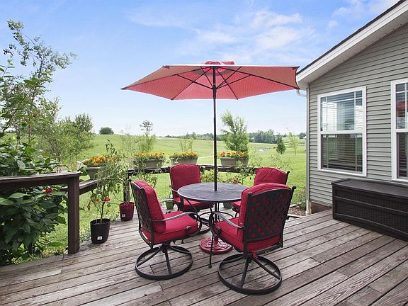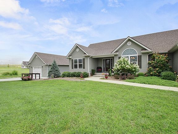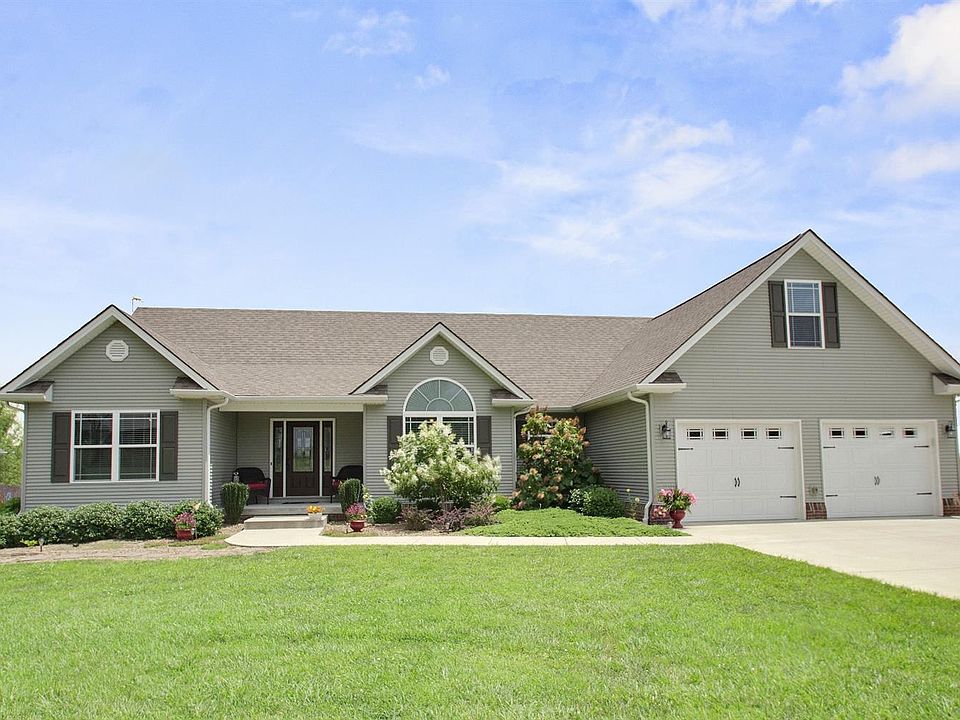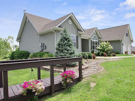 COUNTRY LIVING - Captivating custom built home in impeccable condition. Flowing open floor plan enhanced by luxurious walnut flooring and wood beamed ceilings surrounding a beautiful stone fireplace. Large custom kitchen is clad in premium finishes and stainless steel appliances. Retreat to master suite with alluring master bath and opulent soaking tub after relaxing on one of two decks. The spacious sun room that currently doubles as a home office offers gorgeous views overlooking the extensive landscaped lawn. Four generously sized bedrooms accommodates larger families as does the attached two car garage and extra detached two car garage/shop. Geothermal HVAC and special insulation ensure below average energy costs.