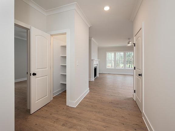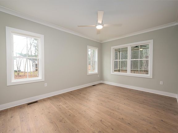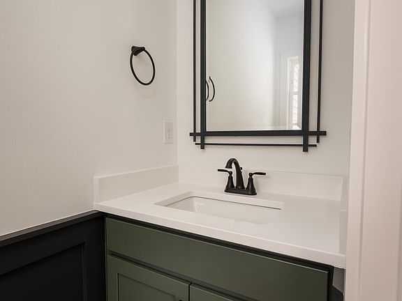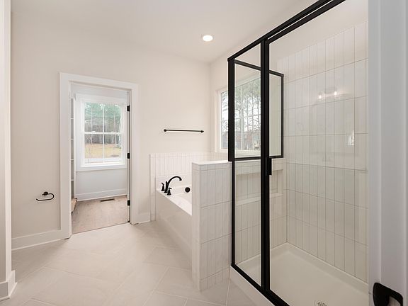 The open-concept floor plan seamlessly connects the family room, kitchen with an island featuring bar stool seating, and dining area. The kitchen boasts black quartz countertops, white shaker-style upper cabinets, and black lower base cabinets. Easy access to a covered rear porch and patio is provided. The main-floor master suite offers a luxurious retreat with a garden tub, separate shower, dual vanities, and a large walk-in closet. A convenient guest half-bath completes the first floor. Upstairs, you'll find two additional bedrooms, two full bathrooms, and a versatile bonus room. A laundry chute on the second floor connects to the laundry/mud room with a drop-off station. A walk-in attic storage space provides ample storage solutions.
