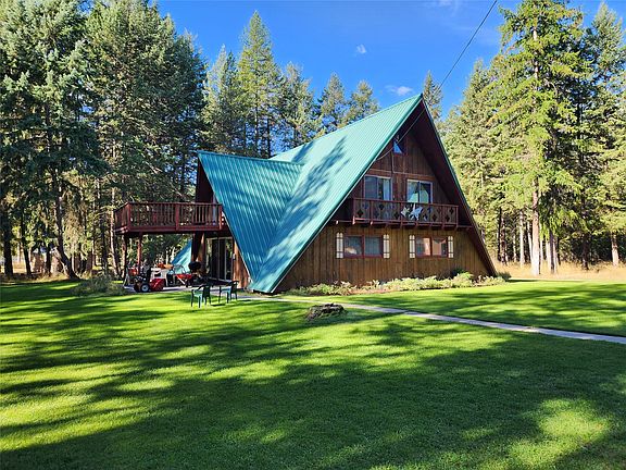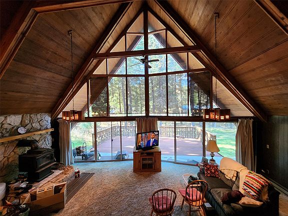 This charming and spacious 4-bedroom 2-bath home with its distinctive A-frame architecture, exudes a rustic yet modern charm that perfectly complements its natural surroundings. Stepping inside you'll find a warm and inviting living area with vaulted ceilings and expansive windows that allow for an abundance of natural light to fill the space. Beautiful rock work is the backdrop for a free-standing wood stove & there is a ductless heat pump for energy efficient heating and cooling as well. There is also electric baseboard for a 3rd source of backup heat. This 2-story, 2133 sq. ft. home provides ample space for family and friends to gather. Upstairs provides an open loft area with access to an oversized deck. Two bedrooms, full bath with additional storage, ensures your family will have the room they need to expand. Kitchen has sliding glass door to a covered patio area, plenty of cabinets and a large center island with sink, making it an ideal space to prepare meals. There are two bedrooms on the main floor with unique built-ins, along with full bath and laundry room. After a day of exploring the recreational opportunities that are in abundance in and around Libby, you can unwind outside on the oversized backyard deck or side patio. There is a two-car detached garage. The lawn is kept lush and green with an underground sprinkler system. Additionally, the home's proximity to downtown Libby, with quick access to J. Neils Park and being only a short distance to the renown Turner Mountain Ski Hill, combines to make this home a haven for outdoor enthusiasts. Call Sharron 406-293-1150 or your real estate professional, to see this lovely home today!