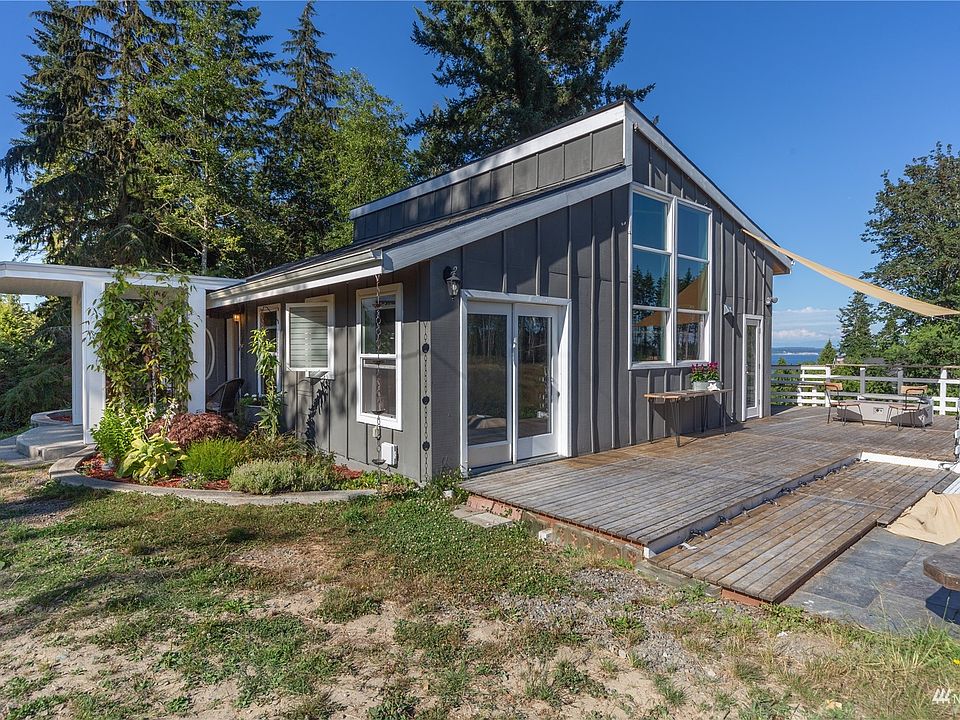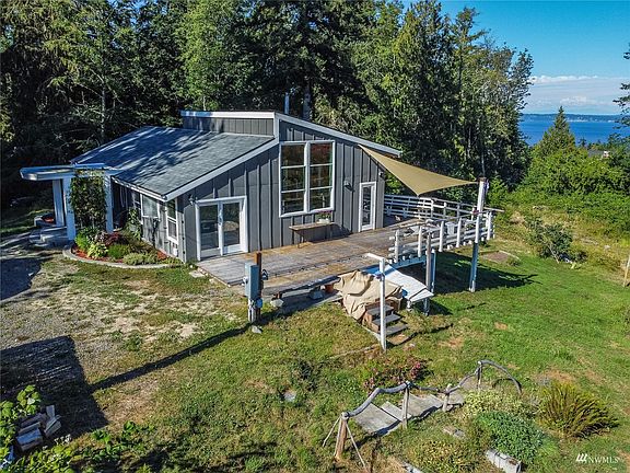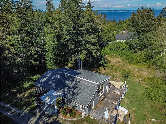 At the end of a tree-lined driveway this gorgeous passive solar design home is perfectly situated to take advantage of south facing sun. In the winter warm sun is so welcome & in summer just open doors/windows for a cooling cross-breeze. You will love tall ceilings, contemporary wood paneling & thoughtful design elements. Enjoy water views with shipping lane traffic to the east & open expanse with wildflowers on the bordering timberland to the south. Living space is open & ideal for indoor/outdoor entertaining. Primary bedroom wing on the north with luxurious bathroom & large walk-in closet. 2nd room can serve as a bedroom or office. Loft area offers plenty of storage or could be an additional sleeping loft. No seller finance, cash only.