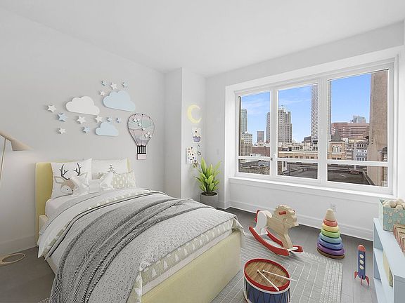 Residents enjoy a wealth of amenities within The Boerum, including a fitness room, lounge, library, and playroom. Furthermore, a landscaped terrace on the 15th floor presents an outdoor kitchen, a lush lawn, and a sun deck facing south, offering a serene outdoor retreat.