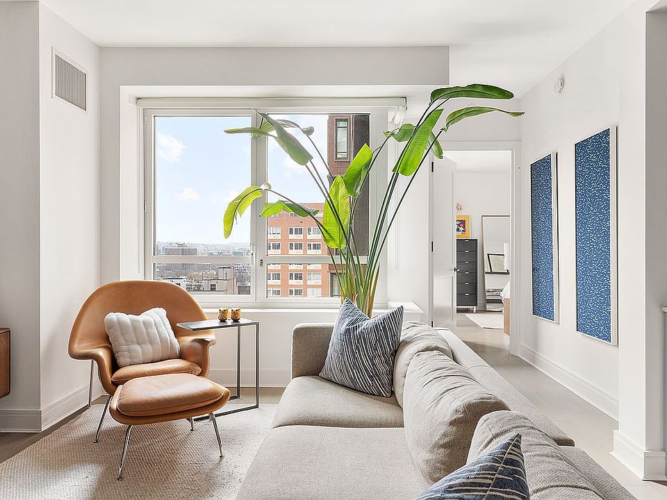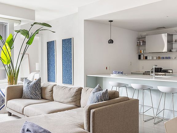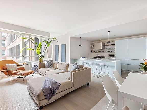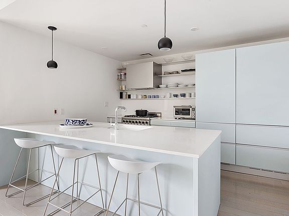 The open concept kitchen boasts brilliant Silestone countertops, lacquered cabinets, Liebherr fridge, Smeg 5-burner range and dishwasher and an island with an overhang for seating into the living room, making for ideal storage and entertaining. The corner living room has plenty of room for full seating and lounging with a separate dining alcove. The master suite has been thoughtfully fitted with a 99% solar shade and a fully customized California Closet to satisfy even the most avid of haberdashers. The master bath features heated Calcatta marble floors for toasty winter mornings and presents a spa experience with porcelain and marble finishes coupled with gleaming Kohler double sinks and Watermark hardware. At the other wing of the apartment sit two more generous bedrooms which share a spacious bathroom as well as an LG washer and fully vented dryer. A half bath, custom solar shades on ALL windows, pre-wiring for Fios, three adjustable zones of air conditioning and your own private storage locker in the basement round out this beauty.