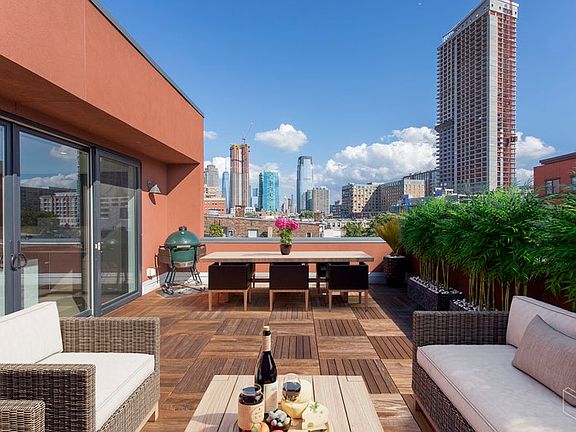 Extraordinary three bedroom and two-and-a-half bath duplex penthouse condo with 1976 square feet, a private rooftop terrace and parking for one car, ideally located in downtown Jersey City's historic Van Vorst Park district only five minutes from the Grove Street PATH station. Designed by award-winning modern design firm Jeff Jordan Architects LLC and completed in 2016, this four-window-wide home feels bright and airy with a wide-open floor plan, clean lines and elegant finishes. The first level consists of three bedrooms and two full baths with the massive master suite featuring a walk-in closet with custom build-outs and a gorgeous master bath double sinks surrounded by marble with a frameless glass shower enclosure. Designed to maximize sunlight, the upper level of this modern home features a 23-foot-wide open living and dining area, a half bath and a stunning custom kitchen with southern exposure that opens up to a 400 square foot private rooftop terrace with ipe wood decking and remarkable views of the Jersey City and Manhattan skylines. The well-designed chef's kitchen is highlighted by Decora cabinetry, a marble backsplash, an oversized marble waterfall island countertop with dual hammered copper sinks, hansgrohe faucets and top-of-the-line Bosch stainless steel appliances. Other highlights include oak hardwood floors and custom closet build-outs throughout, custom window treatments, ample storage, in-unit washer/dryer room, two zones of central heating and cooling, gas-fired on-demand tankless water heater, recessed lighting and an additional storage area. 265 York Street is located on a quiet tree-lined street adjacent to beautiful Van Vorst Park, around the corner from Grove Street's shopping and dining options and only minutes from Jersey City's recently expanded Newark Avenue restaurant row. Only five minutes from the Grove Street PATH with ten minute transit times to a multitude of shopping and dining options in lower Manhattan including Westfield World Trade Center and Brookfield Place.