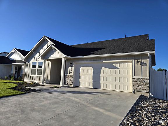 BRAND NEW HOME!  This home has a great floor plan and lives large for the square footage.  Great lighting, neutral colors and open living space floor plan.  This Split bedroom floor plan offers nice amenities and good storage. This home offers Vaulted ceiling in the living space and master bedroom.   Bedrooms have carpet and the living area, bathrooms and utility room has vinyl plank flooring to give you comfortable living mixed with convenient upkeep capability. Quartz countertops in the kitchen and bathrooms. Covered patio, large fenced back yard, automatic sprinklers and sod in the yard for an easy keeper situation while you are moving into your new home.  Located close to the 18 hole golf course in town and this walkable neighborhood has a playground and pickleball courts.  This neighborhood is located on the edge of town and gives views of the foothills and rolling scenery around Payette.  Come tour your new home today.