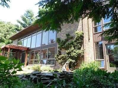 Unique floor plan, Swiss Chalet design, passive solar, new heating & AC, 4 fireplaces, eat-in country oak kitchen, all appliances, 2 master suites w/fireplaces, jacuzzi bath with steam room sauna, formal dining room, 2-car garage, exposed brick, sunroom, 2 spiral staircases, greenhouse atrium, private secluded setting, professional landscape, waterfall, just gorgeous!!!