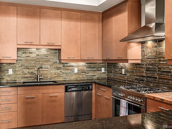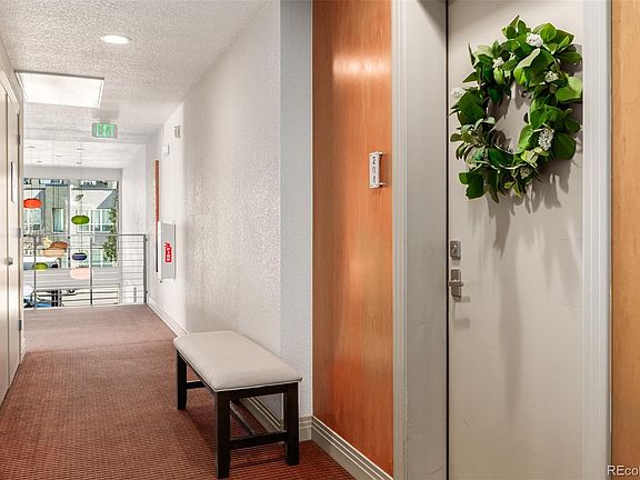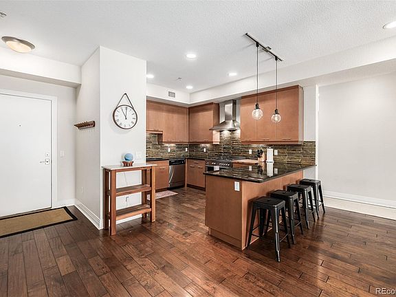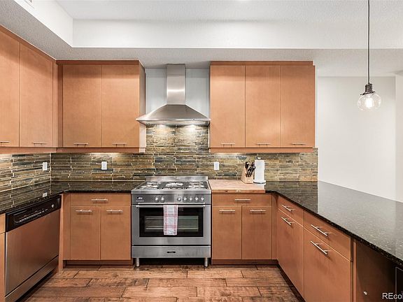 This luxurious 2-bedroom condo, complemented by flexible office space, boasts 2 modern bathrooms and is illuminated with natural light. Its sophisticated finishes include a kitchen adorned with granite countertops, a chic tile backsplash, stainless steel appliances, and a gas stove. The expansive living and dining areas showcase gleaming hardwood floors. The primary suite is generously sized, featuring a private bathroom with heated floors, a spacious glass-enclosed shower, and a walk-in closet fitted with custom shelving. The private deck, equipped with a built-in gas line, is ideal for outdoor grilling and relaxation. The building's rooftop deck presents breathtaking panoramic views of downtown, Elitch Gardens, Mile High, and the majestic mountains. Additional amenities include on-site yoga and fitness rooms. The condo comes with a dedicated garage parking space and an adjacent storage unit, making it a ready-to-move-in gem in a lively urban setting.
