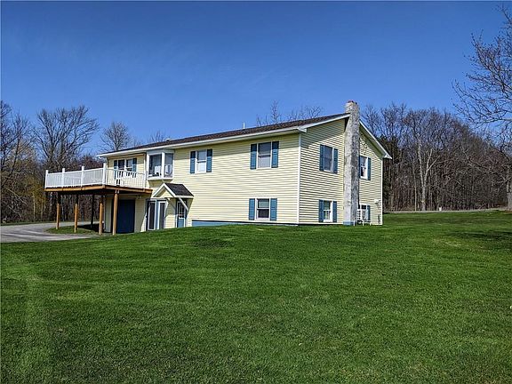 Beautiful rural setting with Keuka Lake views on 6 acres- approximately 4 acres open and 2 acres of woods. Peaceful with abundant wildlife. This spacious and well-built raised ranch home offers 4 bedrooms, large family room with fireplace, and country kitchen with double ovens. Dining area with patio doors that lead out to the private upper deck. One car attached garage plus a 5 bay detached garage with shop. This is a great family home with plenty of space inside and out!