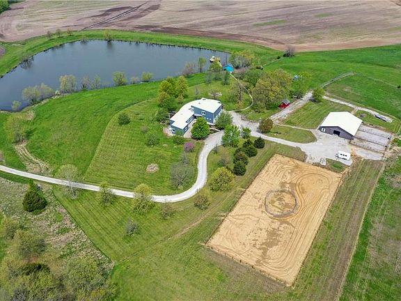 Truely special contemporary home nestled atop a rolling hillside overlooking swimming dock and stocked lake. It sits far off the main road allowing for total privacy. The property features 3 stall barn, outdoor riding arena, chicken coop with chicken yard, raised garden beds, large fire pit area, numerous seating areas, lush landscaping, boat house and large dock. Lake is stocked with blue gill, crappie and bass. Home has a light airy feel with vaulted ceilings, open concept, hardwoods, tract lighting.