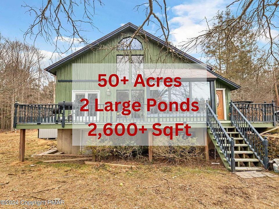 Here's your once-in-a-lifetime opportunity to own a 2,600+ square-foot Pocono Chalet that sits on 50 sprawling acres and has two stunning ponds. Conveniently located just 5 minutes from the Turnpike, this secluded retreat is less than 2 hours from NYC and only 1.5 hours from Philly—making it the perfect combination of convenience and tranquility. The chalet offers updated features, including central air for year-round comfort, as well as soaring vaulted ceilings that create an open and airy feel. Whether you're dreaming of creating a family compound for generations to enjoy, an STR resort that captivates guests, a hunter's paradise, or a private getaway, this property can offer it all.