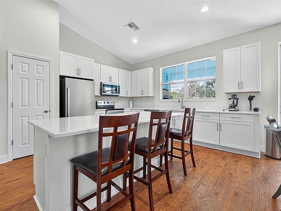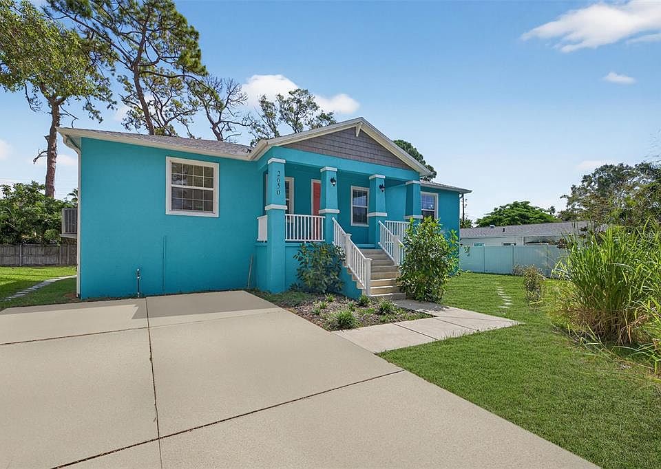 Welcome to modern coastal living in vibrant Gulfport! Built in 2022, this 3-bedroom, 2-bath elevated home combines contemporary design, energy efficiency, and relaxed Florida comfort. Step inside to soaring vaulted ceilings and an open-concept floor plan that perfectly blends style and functionality. The gourmet kitchen impresses with quartz countertops, soft-close shaker cabinetry, and stainless steel appliances, ideal for everyday cooking or entertaining. The living and dining spaces flow seamlessly to the covered front and back porches, offering peaceful spots to enjoy Gulfport's breezy evenings. The split floor plan ensures privacy, with a spacious primary suite featuring a tray ceiling, walk-in closet, double vanity, and a walk-in shower with modern finishes. Two additional bedrooms and a full bath provide comfort and flexibility for guests or a home office. Beautiful LVP flooring runs throughout the home, and the oversized laundry room is equipped with a Samsung washer and dryer for added convenience. Additional highlights include double-pane windows, a Trane HVAC system (2022), AO Smith 40-gallon water heater, and a 200-amp Square D electrical panel for peace of mind. Located on a quiet street just minutes from Gulfport's charming downtown, the beach, and St. Petersburg's vibrant dining and arts scene, this home offers the perfect mix of quality, comfort, and coastal charm. Available lightly furnished or unfurnished ready for you to move right in and enjoy the Gulfport lifestyle!