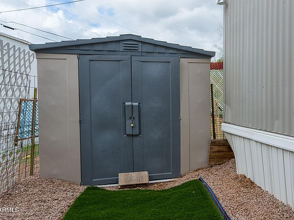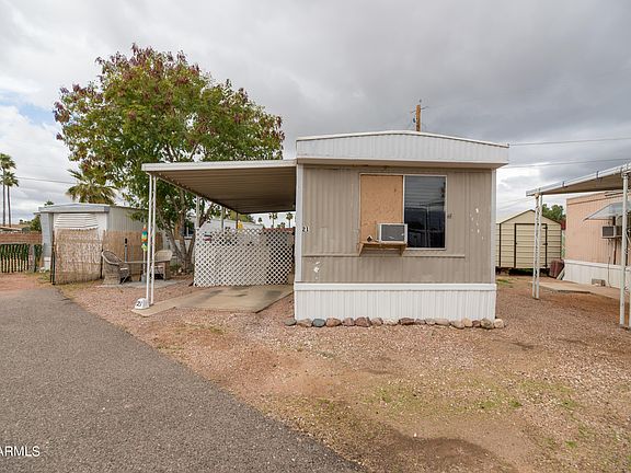 This extra cozy single wide 1BR/1BA MH home in an all-age community is now available for you. Home features a great outdoor space with a porch to enjoy the AZ weather, a storage shed, and a single carport space. Upon entrance there is open concept kitchen/living space. The hallway separates bedroom from main living area. Laminate and tile flooring throughout, no carpet! This home has 3 AC wall units. Come tour this one today!